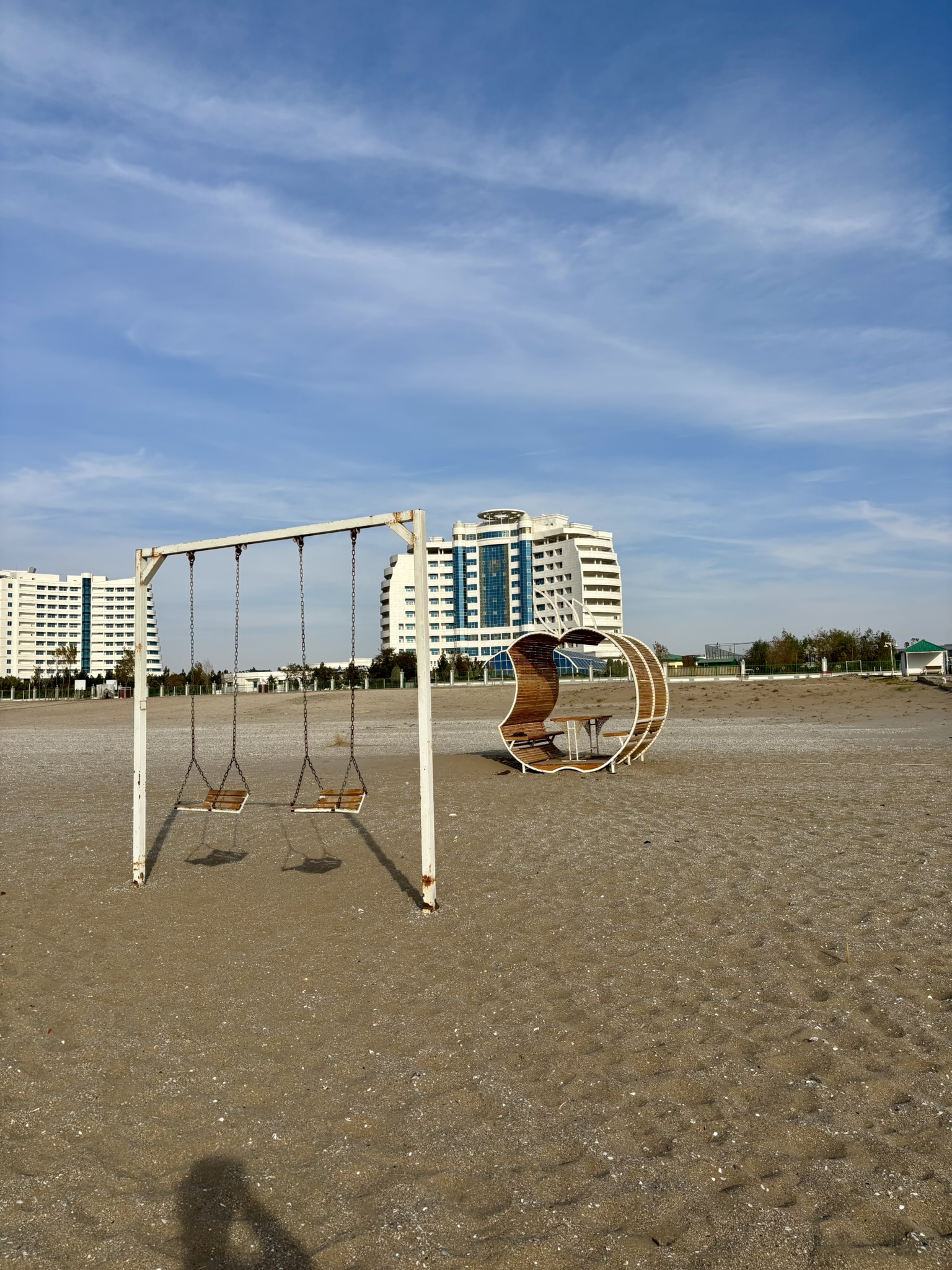 Na het inchecken in ons hotel gingen we naar het strand. Hoewel het november was, lag de temperatuur nog rond de 15 graden. Erwin heeft zelf nog gezwommen in de Kaspische Zee! Net als op veel andere plekken in het land viel vooral op hoe rustig en leeg alles was: nauwelijks mensen, zelfs in een officieel vakantiegebied.