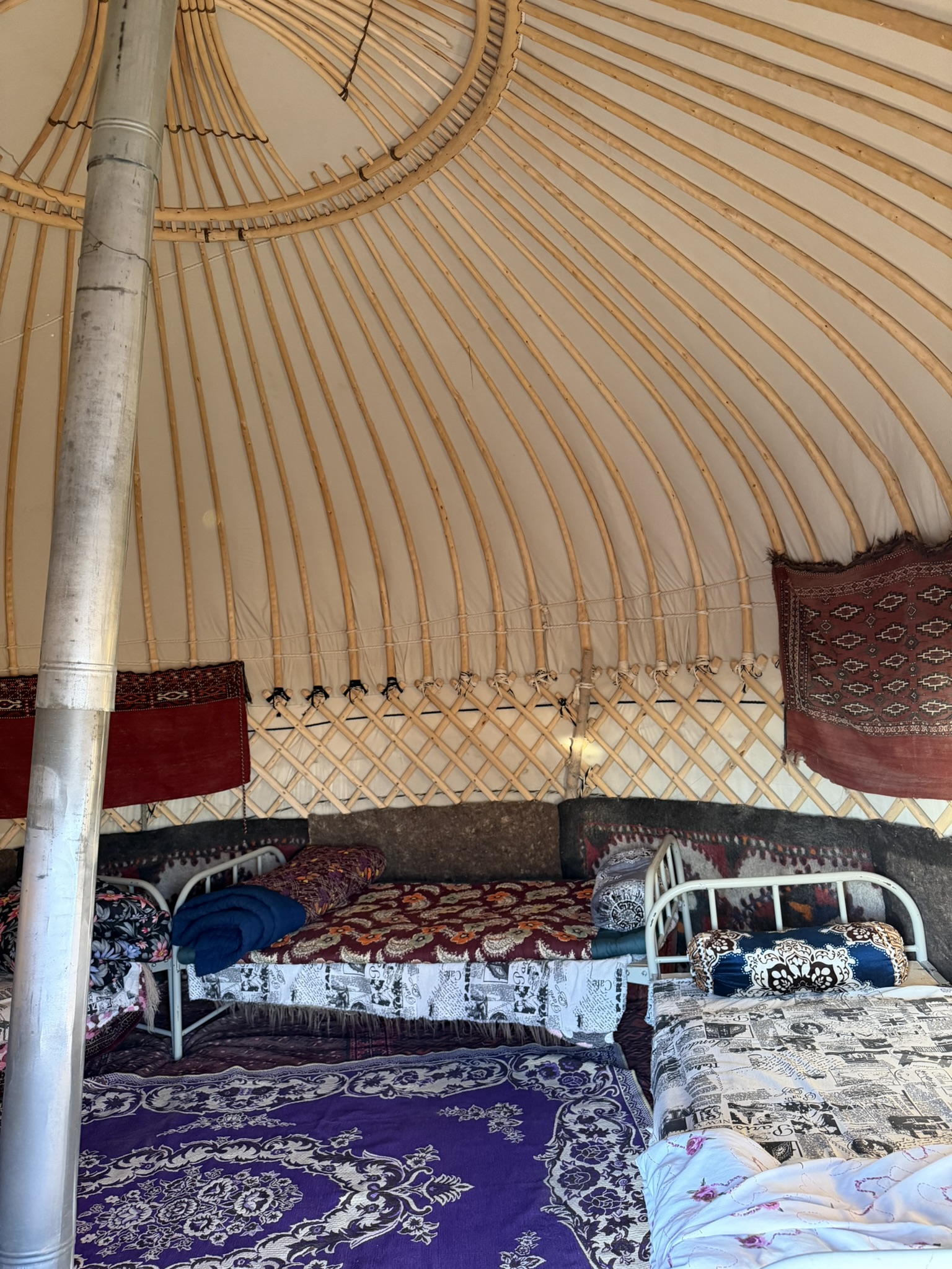 Samen met Erwin en Nelleke besloten we met z’n vieren in één yurt te slapen in plaats van apart. Het voelde een beetje als een slaapfeestje midden in de woestijn, een perfecte afsluiting van een bijzondere dag.