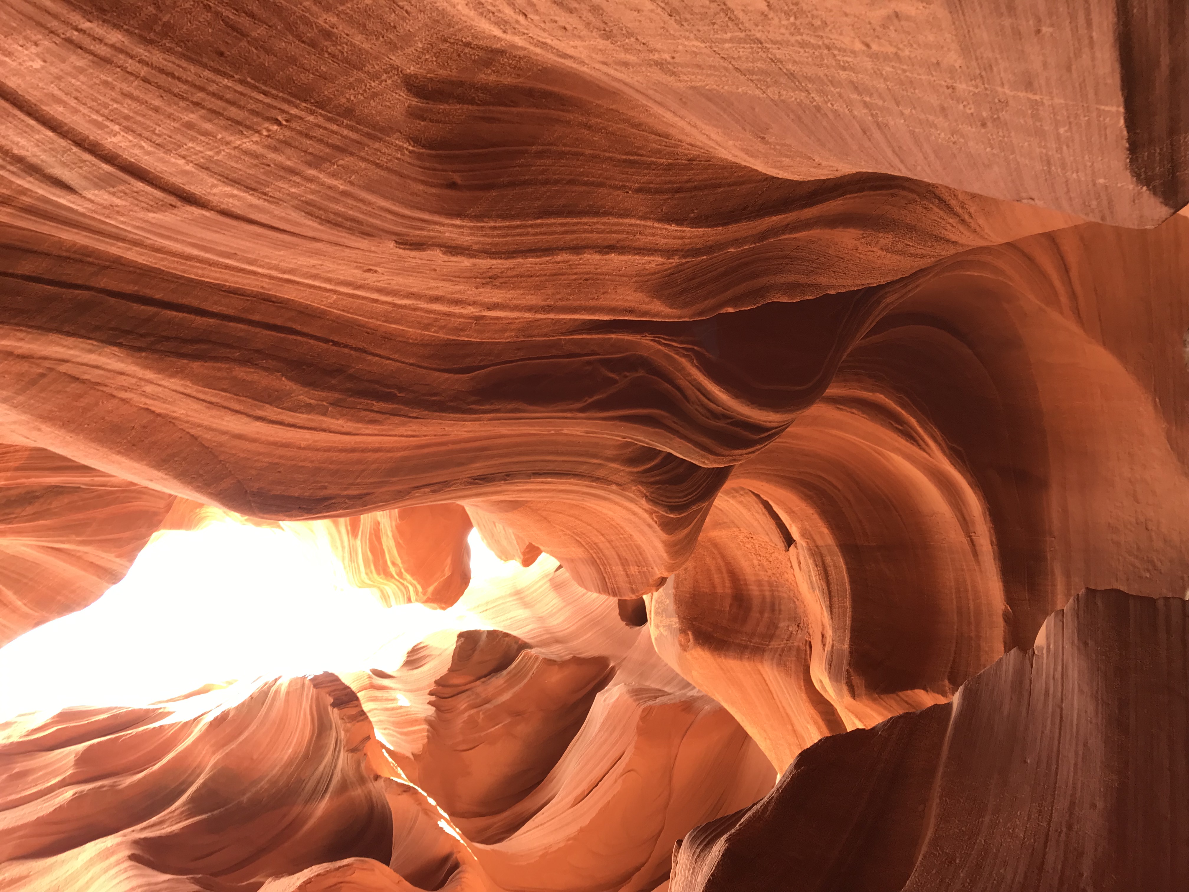 In Page bezochten we de Lower Antelope Canyon, een smalle kloof gevormd door wind en water. Onze gids legde stap voor stap uit hoe deze unieke rotsformaties zijn ontstaan. Een leerzaam en fascinerend verhaal. Het licht dat door de nauwe wanden valt, geeft een magisch effect op de rode en oranje tinten van de rotsen.
