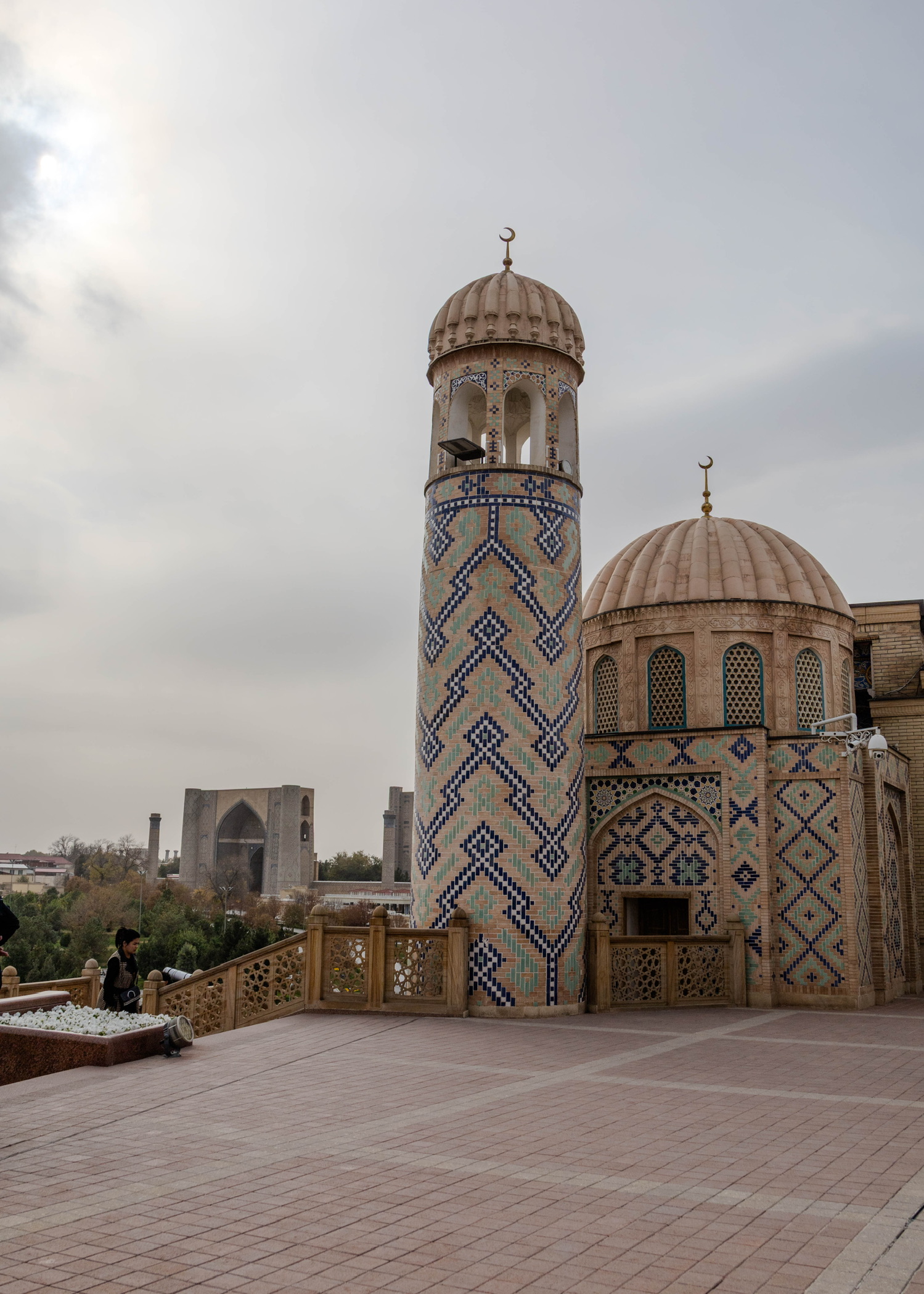 Loop daarna richting de Hazrat Khizr Mosque, gelegen op een heuvel net buiten het drukste deel van de stad. Deze moskee voelt een stuk rustiger aan en biedt een mooi uitzicht over Samarkand en de omgeving.