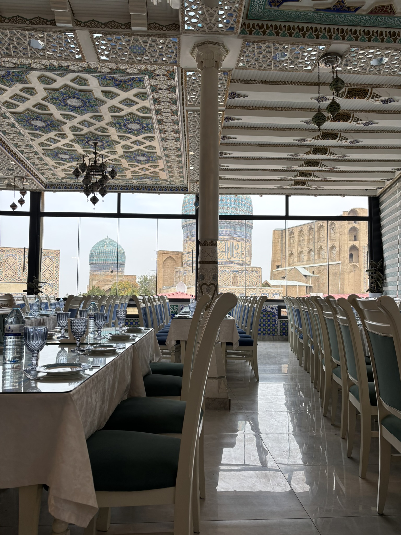 De menukaart bestaat uit lokale gerechten en klassiekers uit de Oezbeekse keuken. Terwijl je geniet van je lunch, kijk je uit op één van de grootste moskeeën van Centraal Azië: een uitzicht dat de ervaring extra bijzonder maakt.