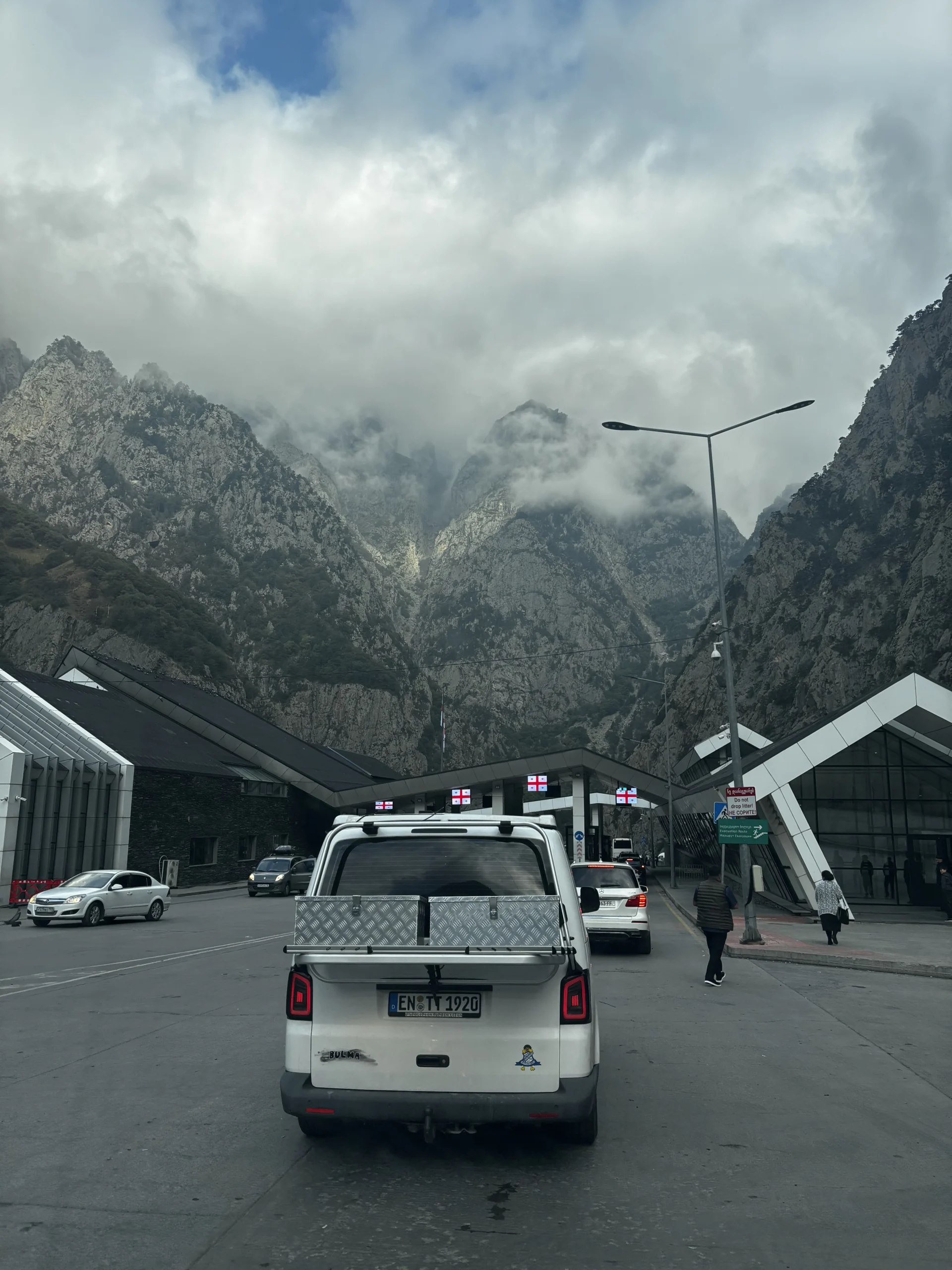 De grensovergang van Georgië naar Rusland is behoorlijk groot, mede door het lange stuk niemandsland tussen de bergen. Het begint met een eerste inspectie van je voertuig en paspoort in Georgië. Passagiers moeten een gebouw in, waar een paspoortcontrole plaatsvindt en grote tassen eventueel worden gescand.