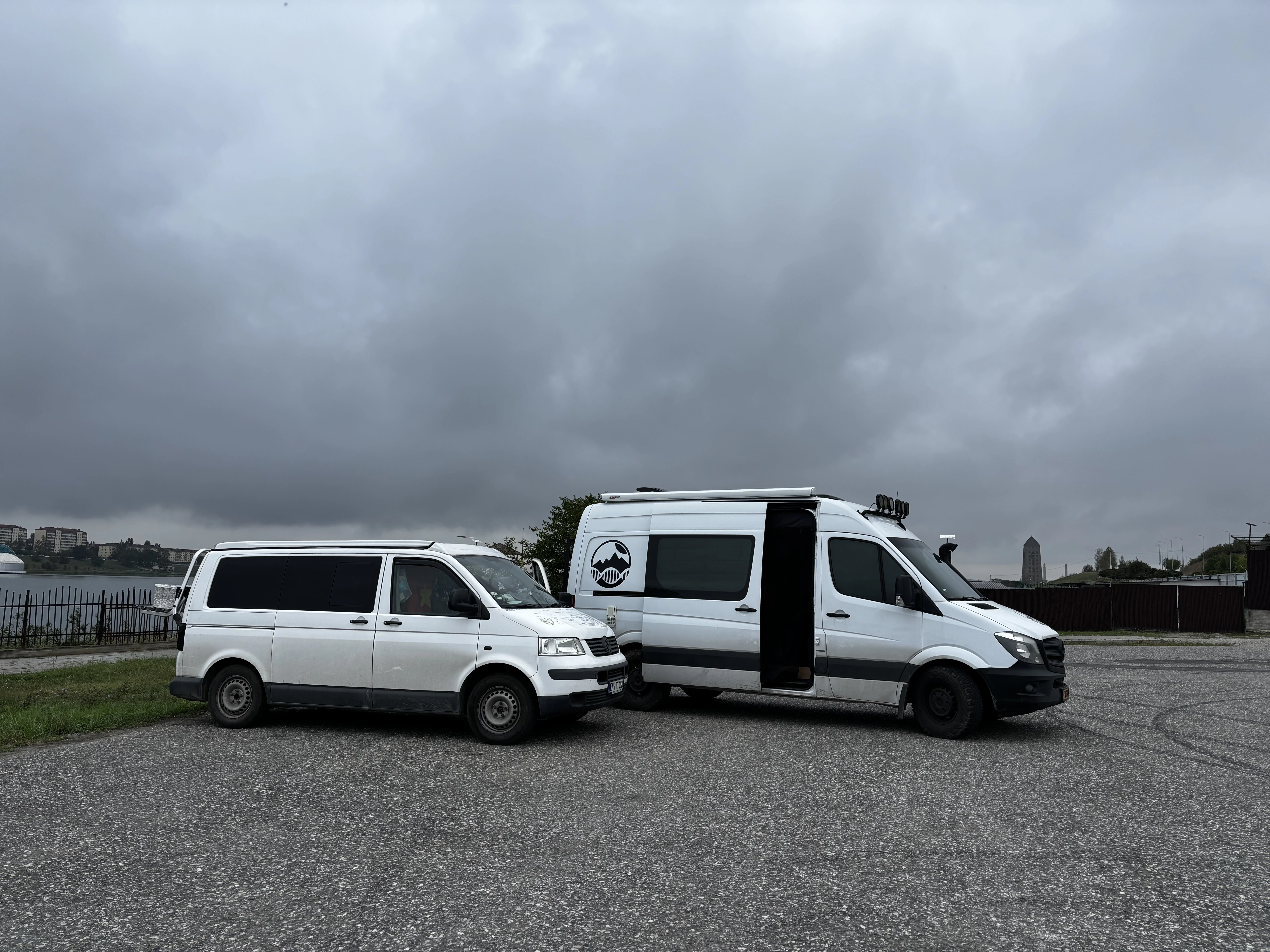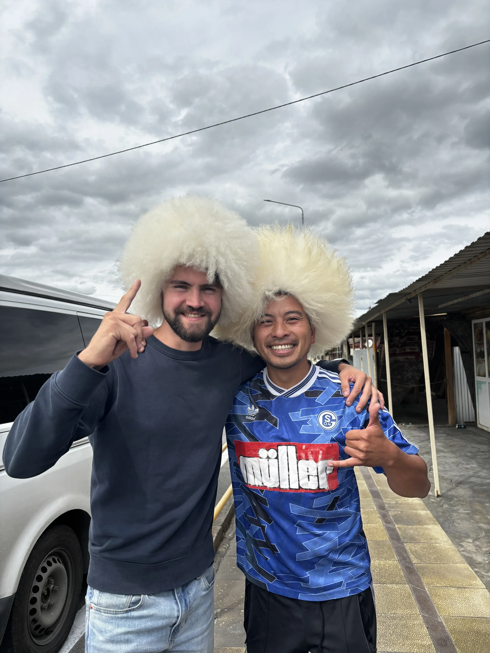 Na een overnachting bij het Vriendschapsmonument van Georgië en Rusland vertrokken we op 17 september vroeg richting de grensovergang. In de zomermaanden kan het er eindeloos druk zijn, vooral met vrachtwagens. Wij arriveerden rond 08:00 uur en het was rustig, maar de grensovergang zelf kostte ons vrijwel de hele dag. Tessa raakte Sander en Kien (een Duitser waarmee we samen reisden) kwijt. Zonder telefoon besloot ze met een lokale Rus de grens over te gaan als ‘lifter’. Sander en Kien wachtten twee uur voordat ze via “Find My” zagen dat Tessa’s Apple Watch al in Rusland was. Uiteindelijk vonden we elkaar aan het einde van de middag weer. Gedurende vijf uur werd Tessa opgevangen door vriendelijke truckers, die haar eten, drinken en zelfs een dutje in de cabine aangeboden.