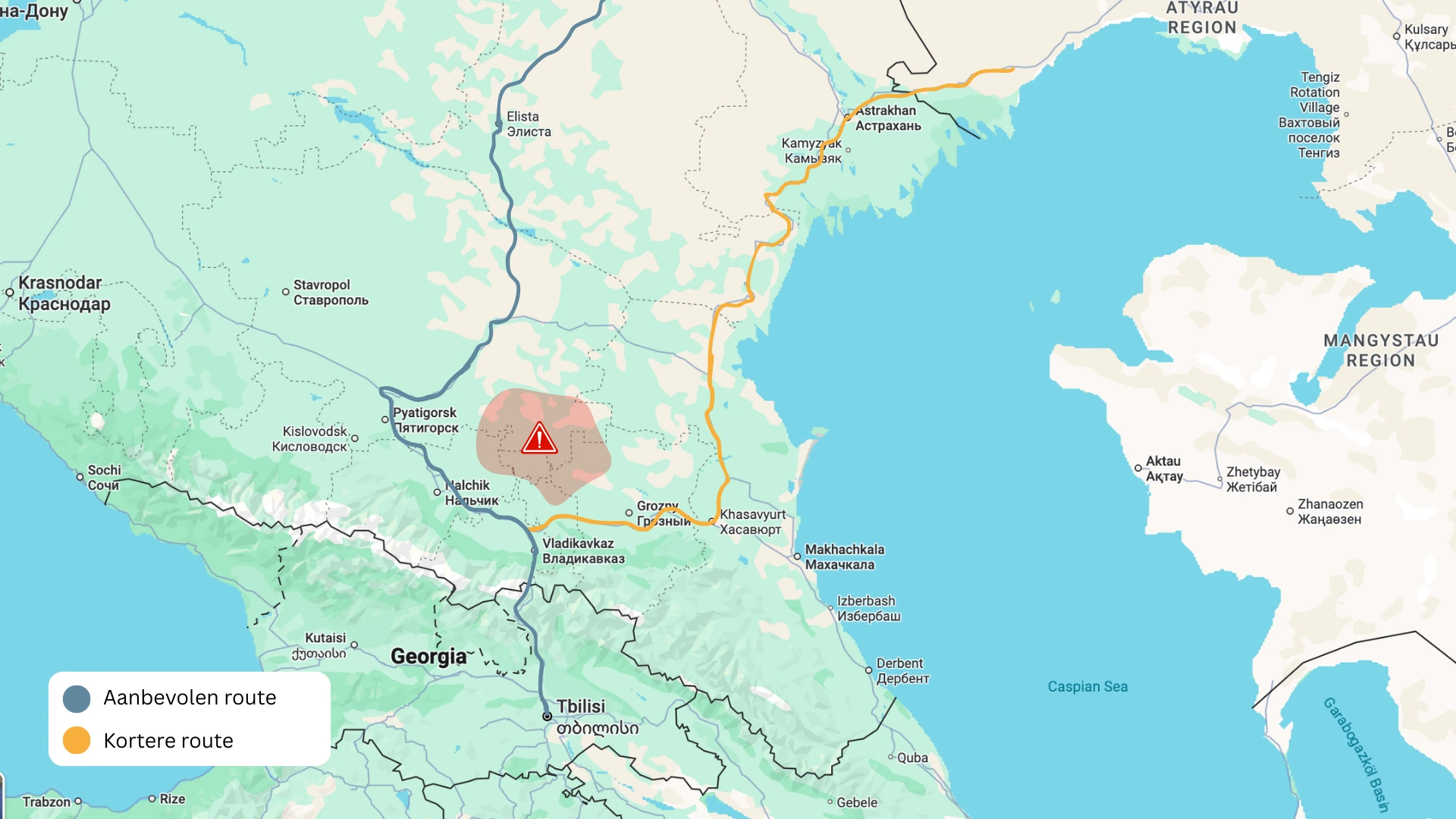 Vanuit Georgië is er eigenlijk maar één grensovergang naar Rusland. Je volgt de Military Highway omhoog vanuit Tbilisi, een prachtige route door de bergen. Op de online visumaanvraag moesten wij aangeven dat we via Vladikavkaz en Elista naar Kurmangazy zouden rijden. Er is een snellere route naar de grens die door Dagestan loopt, maar let op: hier zijn meer controles (gele route).
